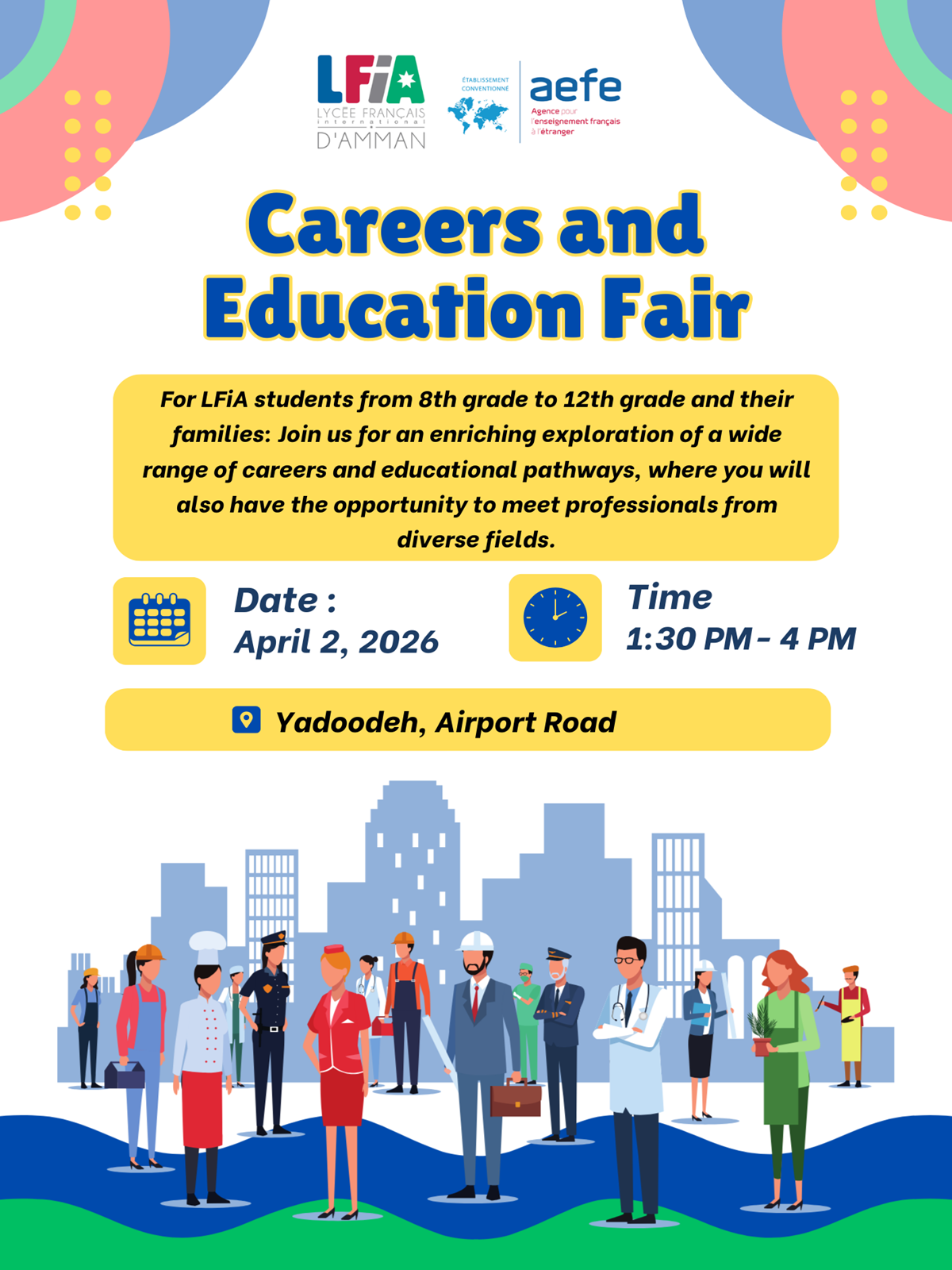 إلى طلاب المدرسة الفرنسية الدولية في عمّان من الصف الثامن إلى الصف الثاني عشر وكذلك إلى عائلاتهم! انضموا إلينا لاكتشاف ثري لمختلف المهن والتخصصات، ولقاء مهنيين من قطاعات متنوعة، وذلك يوم الخميس 2 أبريل 2026 من الساعة 13:30 حتى 16:00 في مبنى الثانوية، موقع اليادودة. هل ترغبون في تقديم مهنتكم أو مؤسستكم لطلابنا خلال المنتدى؟ يسعدنا استقبالكم!