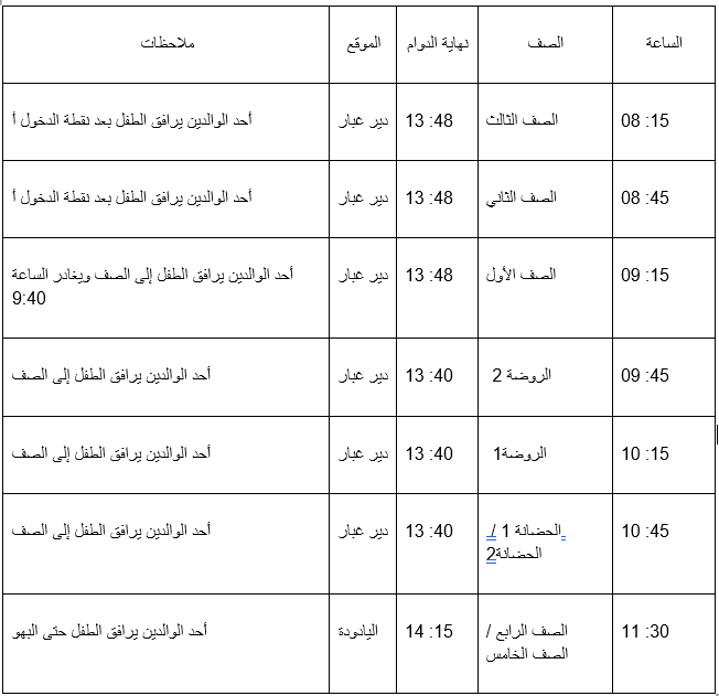– تبدأ العودة إلى المدرسة في الساعة 10:00 صباحًا لجميع الطلاب، باستثناء طلاب الصف النهائي الذين يبدأون في الساعة 9:00 صباحًا.